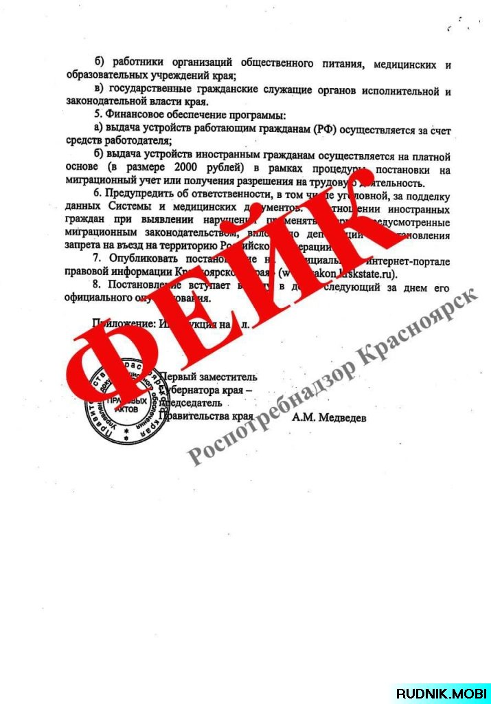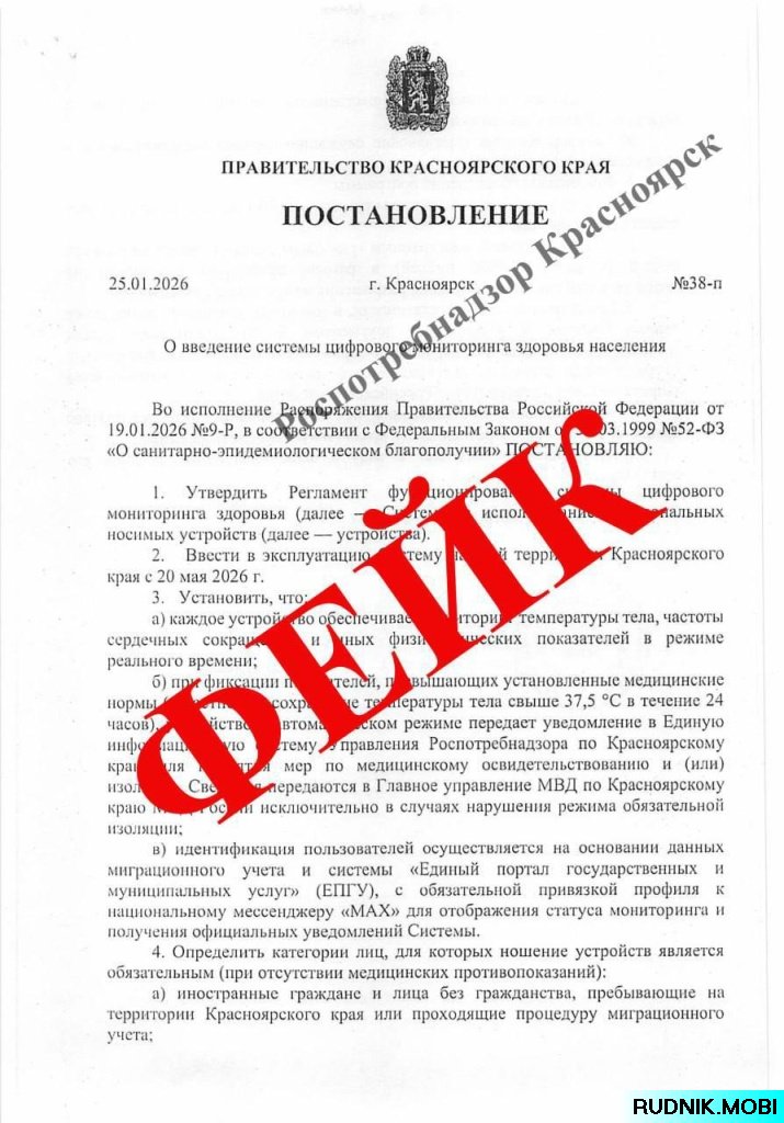 В социальных сетях и мессенджерах жители Красноярского края активно обсуждают тревожный документ — якобы официальное постановление о введении тотального контроля за здоровьем. Фейк, оформленный в стилистике правительственных бумаг, вызвал волну беспокойства среди населения.