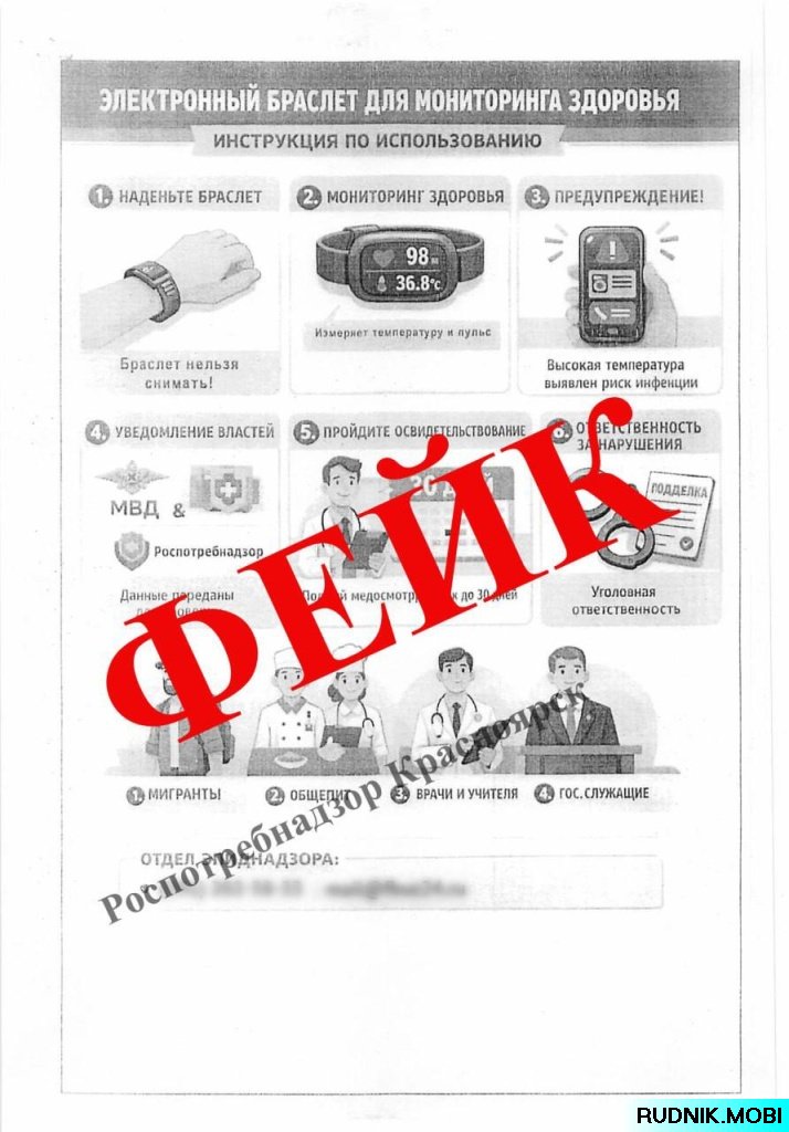 В поддельном документе утверждается о скором обязательном ношении специальных браслетов для чиновников, врачей, учителей, работников сферы услуг и мигрантов. Устройства, согласно тексту, должны в режиме реального времени отслеживать ключевые показатели здоровья — температуру, пульс, давление — и передавать данные в Роспотребнадзор через мессенджер MAX.